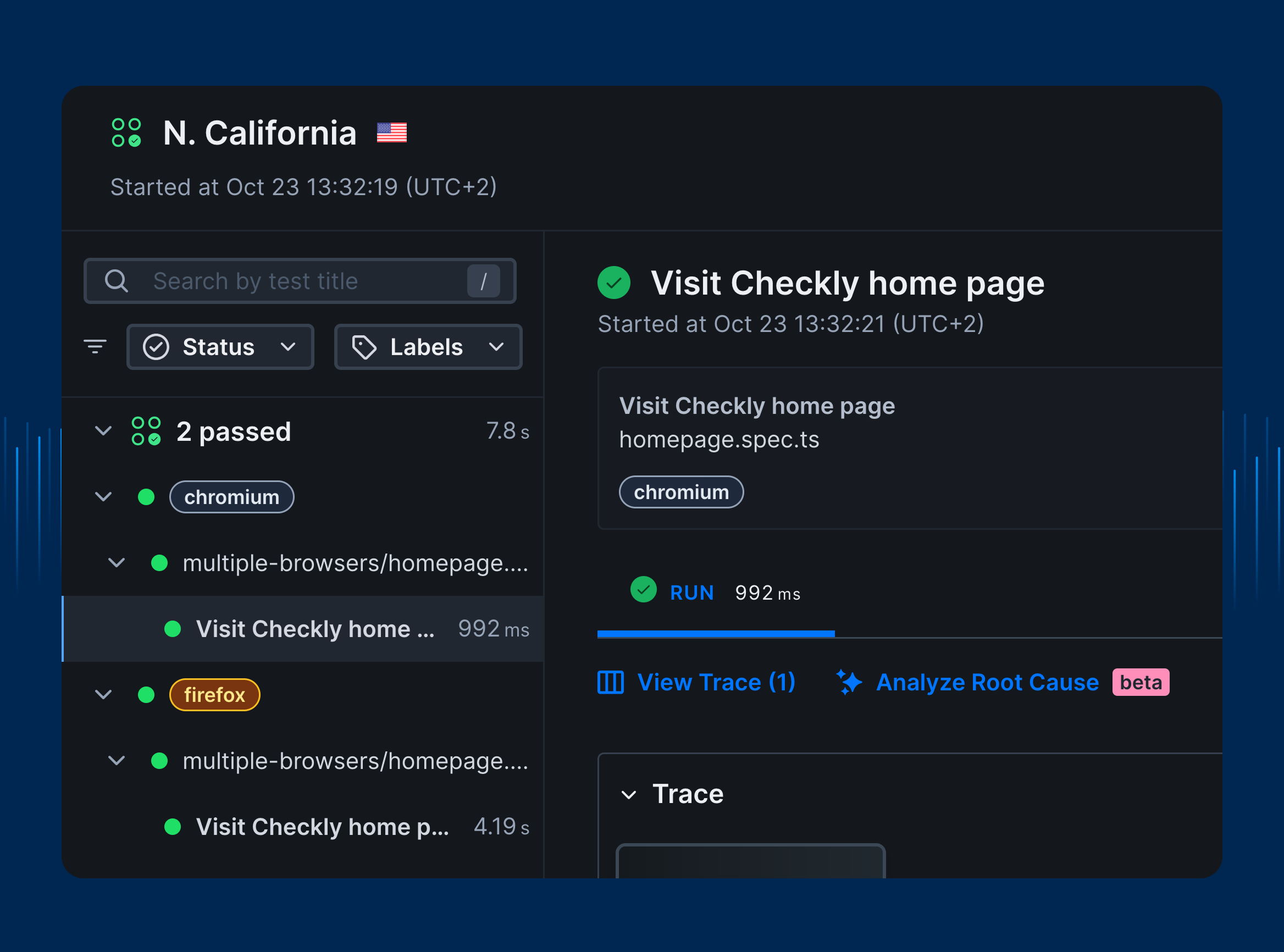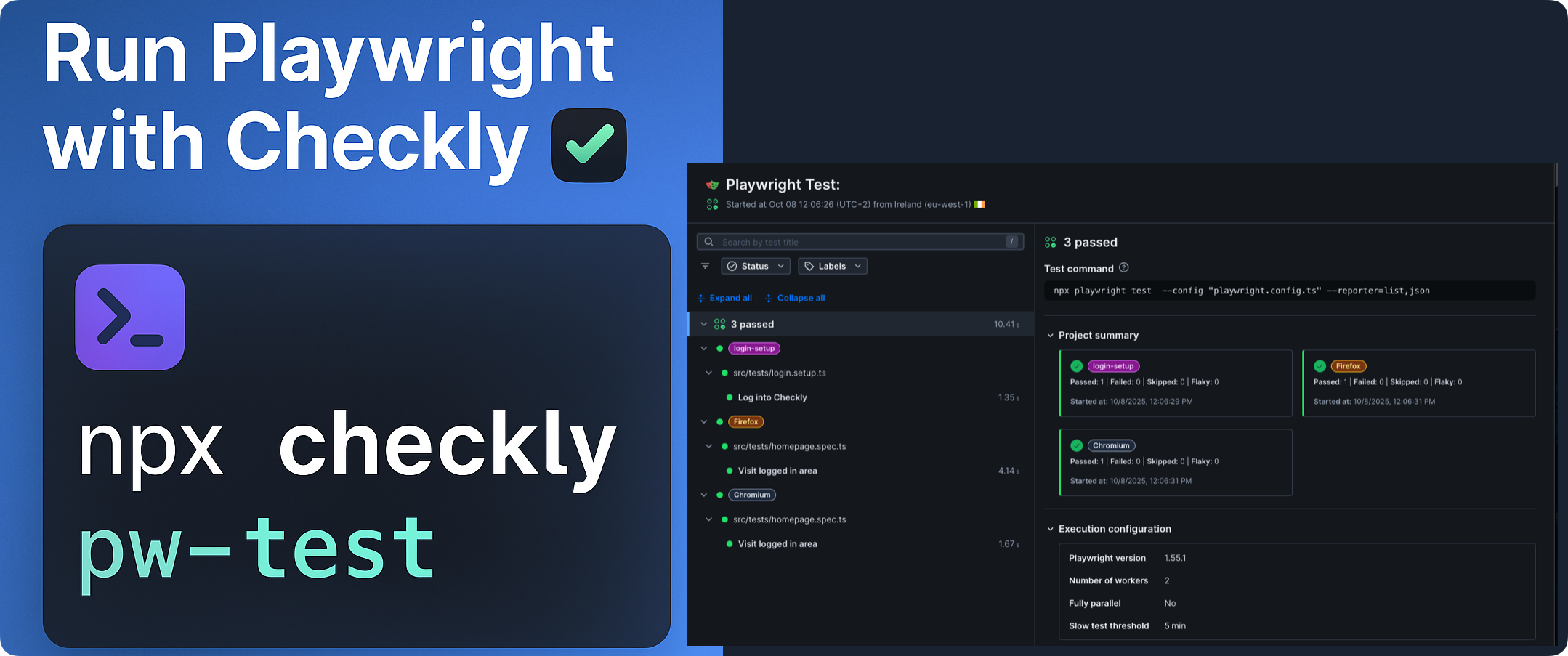npx checkly pw-test --create-check -- --project="firefox"Test and create Playwright Check Suites from your local repository using pw-test. Learn more in our docs.