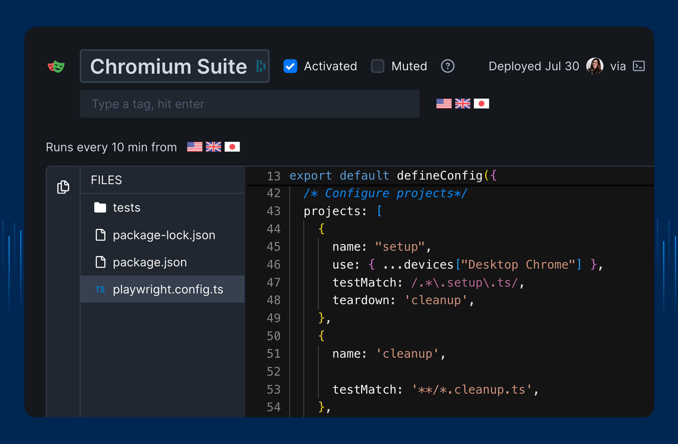 Reuse your existing Playwright test suites 1:1 as production-grade, scheduled checks.
