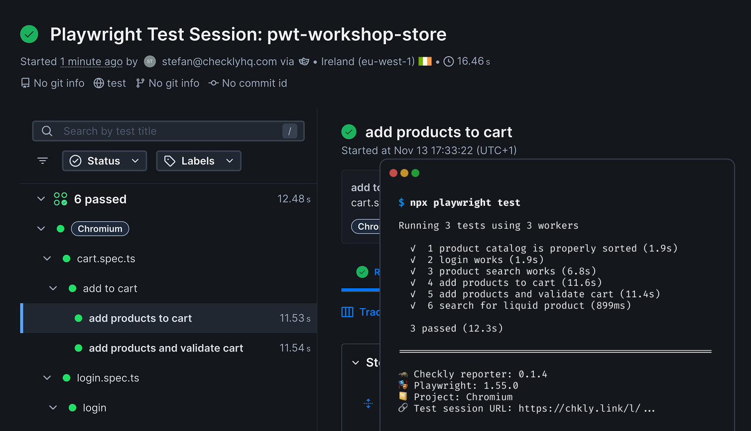 Checkly’s Playwright Reporter is here to make it easier to keep track of your Playwright tests wherever they run: locally, in CI/CD, or as monitors in Playwright Check Suites. It’s still early, we’ve built it to bring more clarity to your test suite: