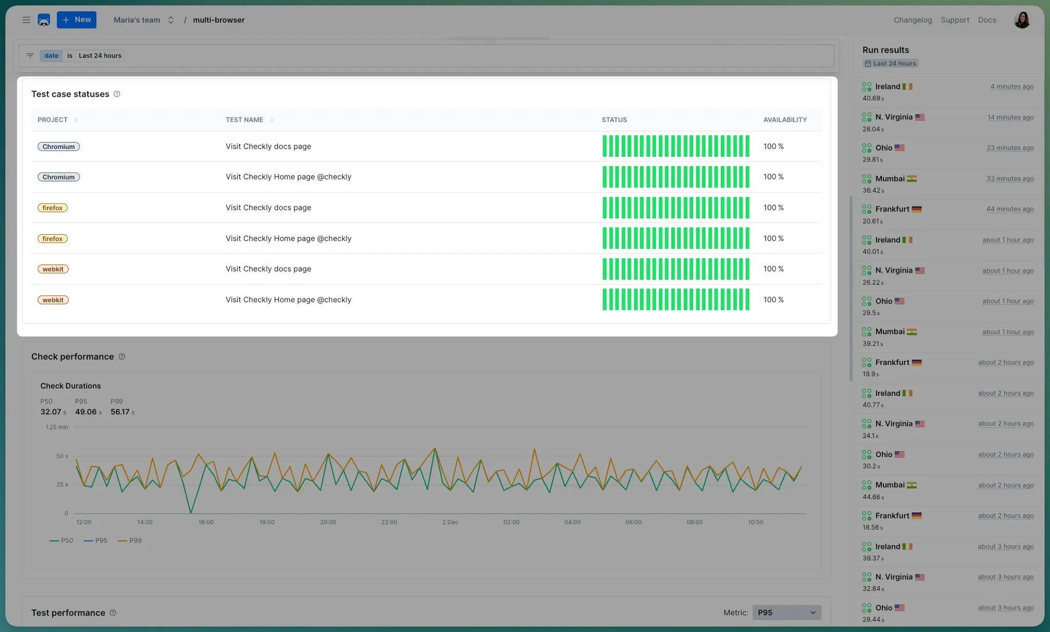 The check overview now shows per-test and region execution duration and flaky test insights. Duration graphs filter down based on your selected views for a clean, consistent UX.