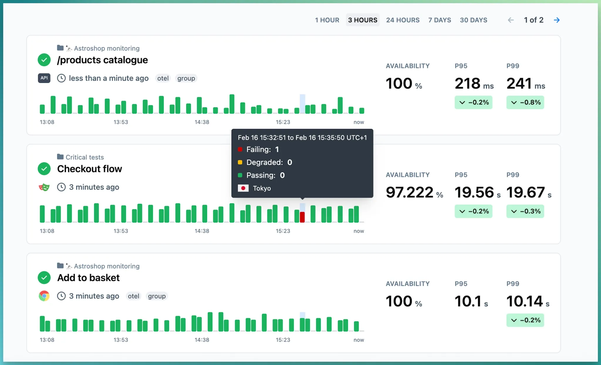 Dashboard charts now display data based on the selected time range, so all checks on a dashboard share the same timeline. This makes it easier to compare results and understand what happened across your services.