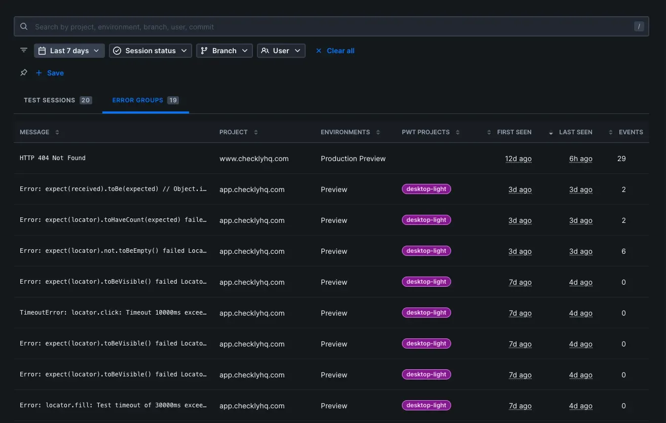 You can now find all errors that happened during Test Sessions in the new “Error Groups” tab. Error Groups for Test Sessions work the same way as Error Groups for scheduled checks and monitors, but add dimensions for "project" and "environment" properties, populated by the Checkly CLI.