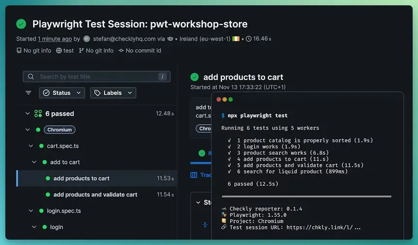 Checkly’s Playwright Reporter is here to make it easier to keep track of your Playwright tests wherever they run: locally, in CI/CD, or as monitors in Playwright Check Suites. It’s still early, we’ve built it to bring more clarity to your test suite: